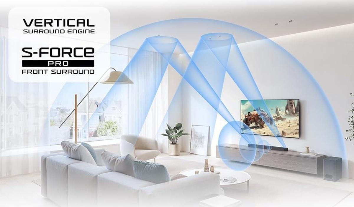 サウンドバーの左右上部に配置されたイネーブルドスピーカーが上方向に飛ばした音を天井に反射させることで、観る人の頭上から音が降ってくるようなサウンド体験を実現します。