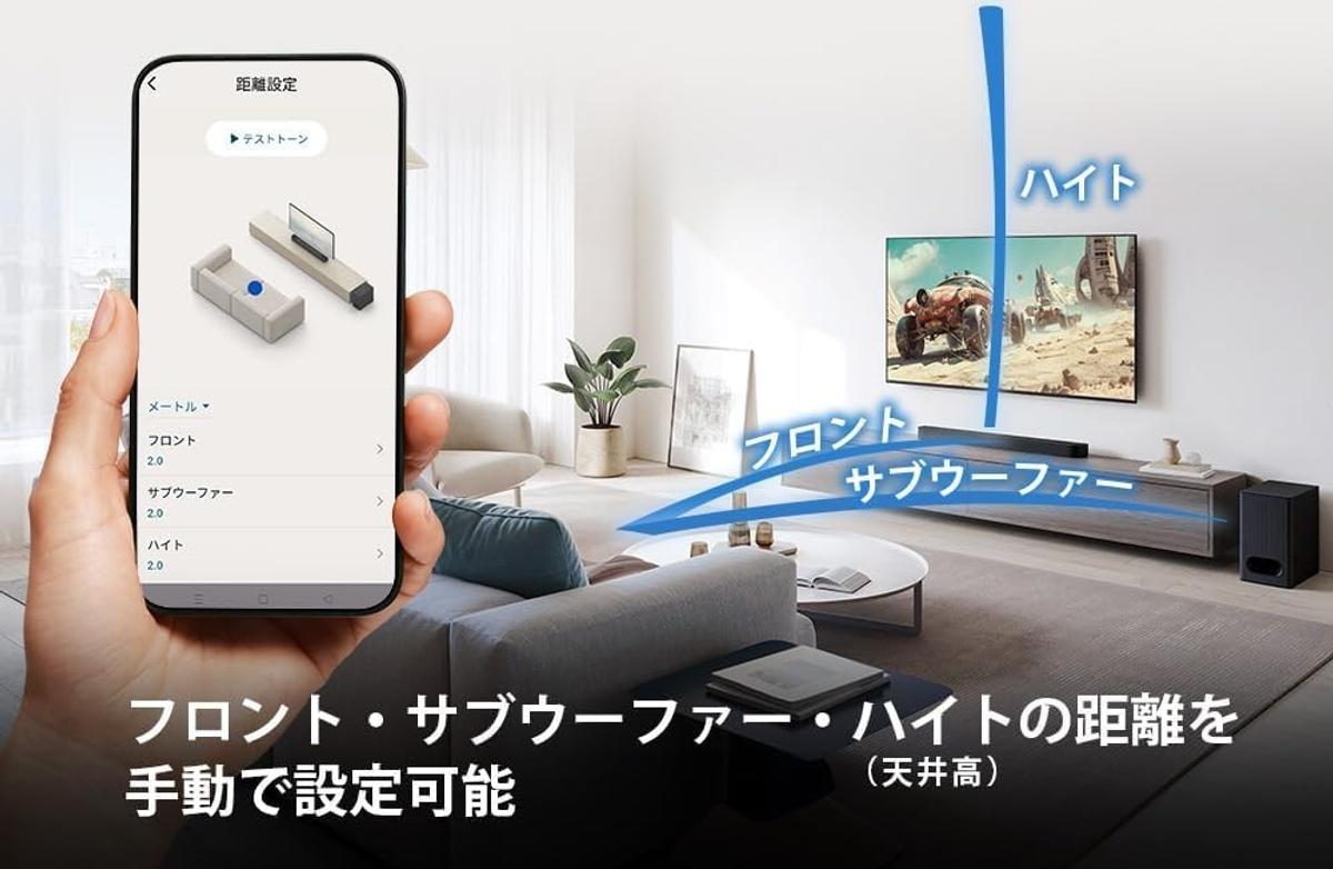 設置も非常にシンプルで、テレビとサウンドバー本体をHDMIケーブル1本(eARC対応)でつなぐだけ。テレビとの距離や天井の高さをアプリに入力するだけで最適な音響に自動調整してくれるサポート機能を使えば、誰でもかんたんに極上のサウンドを楽しむことができますよ。
