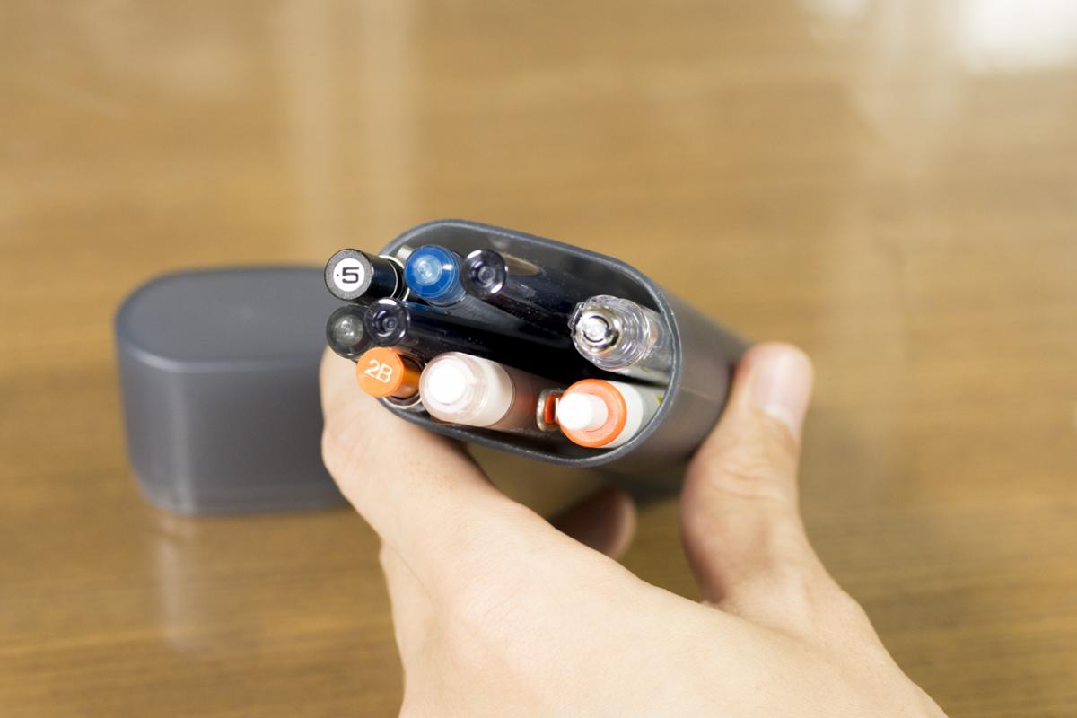 ペンの種類にもよりますが、ペンのみで9本ほど収納可能なので、最低限必要な筆記用具を持ち歩くには十分な容量。