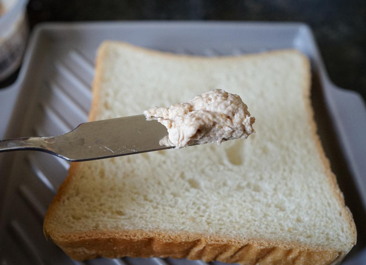 容器にペースト状のクリーム色のスプレッドが入っていますが、よく見るとつぶつぶの砂糖が入ってあり、その食感が癖になります。