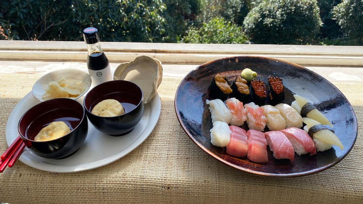 鈴木水産の握り寿司(うに、いくら、えび、ホタテ、数の子、中トロ、大トロ:あれ? 16貫に減ってしまったよ。前は18貫あったはず)、麩のお吸い物。