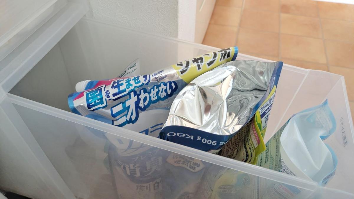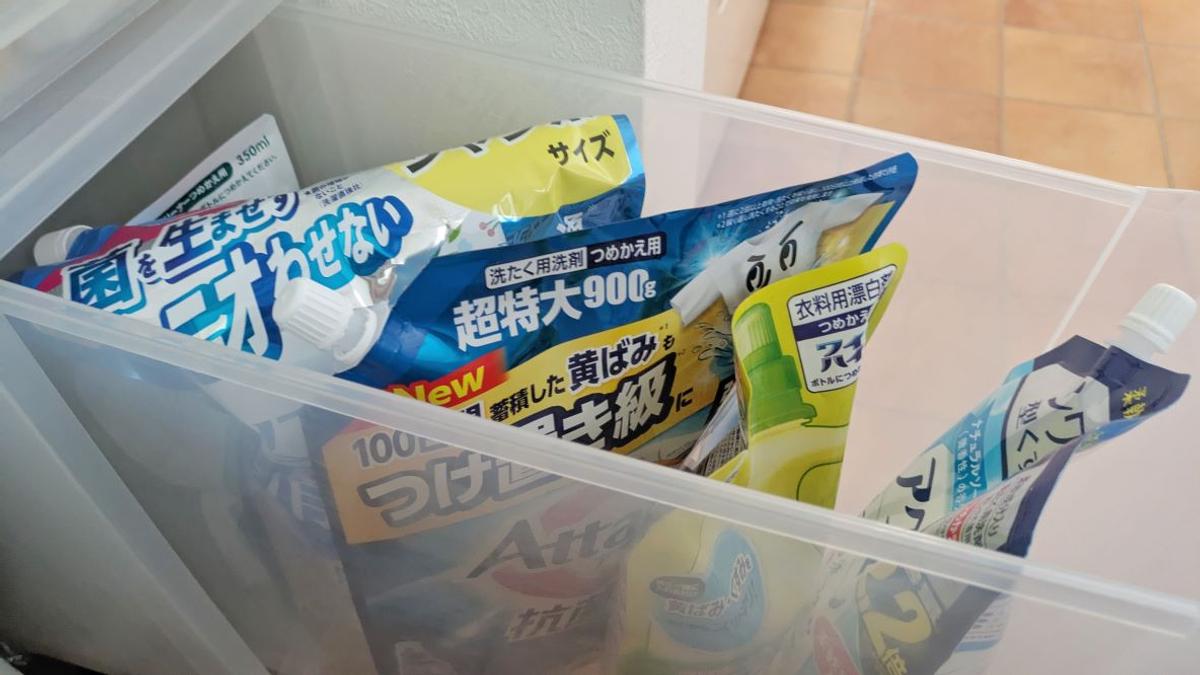 詰め替え洗剤をボックスや引き出しに入れている場合は、きちんと上下を守ると底の厚みの分、幅を取ってしまいあまり数が入りません。