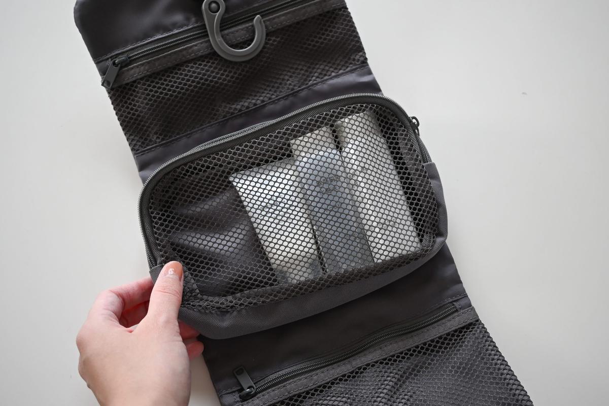 旅行用ポーチに入れっぱなしにしておくことができ、先ほどの吊るして使えるポーチにもぴったり入ります。