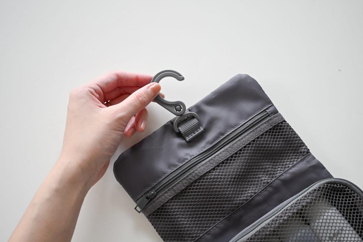 旅行の持ち物でまず外せないのが、「ポリエステル 吊るして使える着脱ポーチ付ケース」。