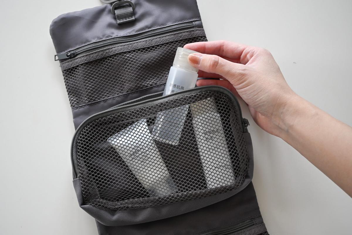 洗顔やスキンケア用品なども使うときにサッと取り出すことができ、洗面台が狭いホテルでも置きやすいのが便利!