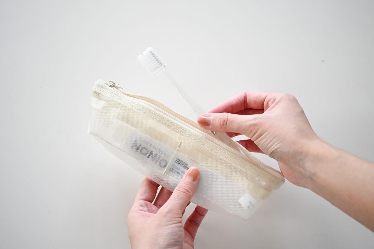 メッシュ素材なので、歯磨き後すぐにしまいたいときも濡れたまま入れることができるのが◎。