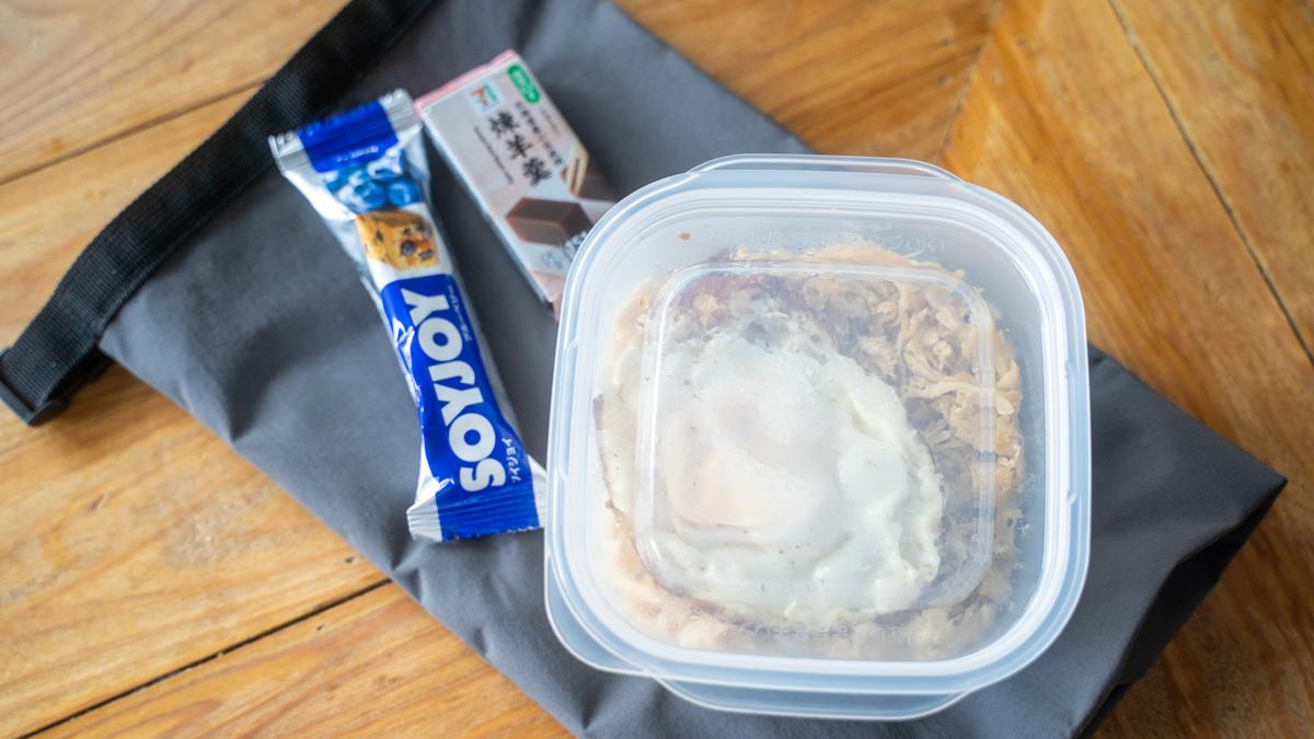 普段持ち歩いているのは、ご飯150〜200gに鶏むね肉と卵をベースにした1食分。