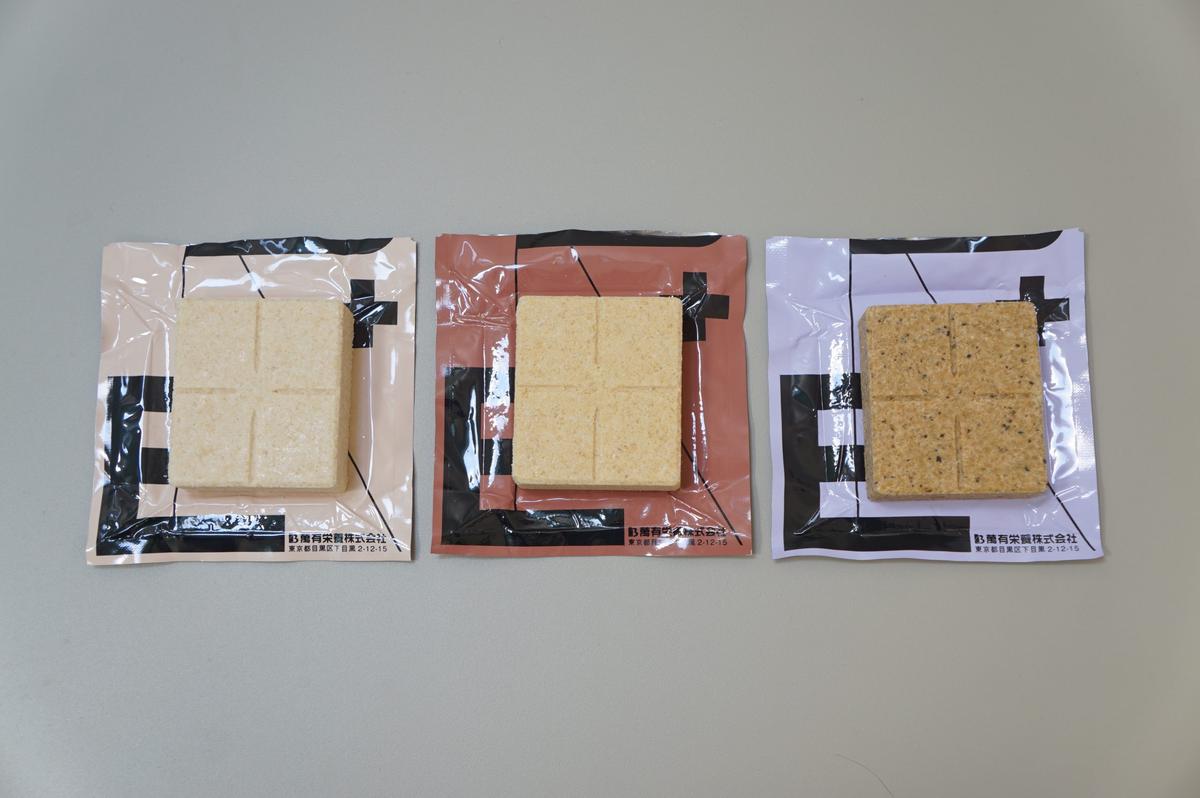 写真左は「ココナッツ風味」、中央は「VEGE(野菜風味)」、右は「紅茶風味」です。