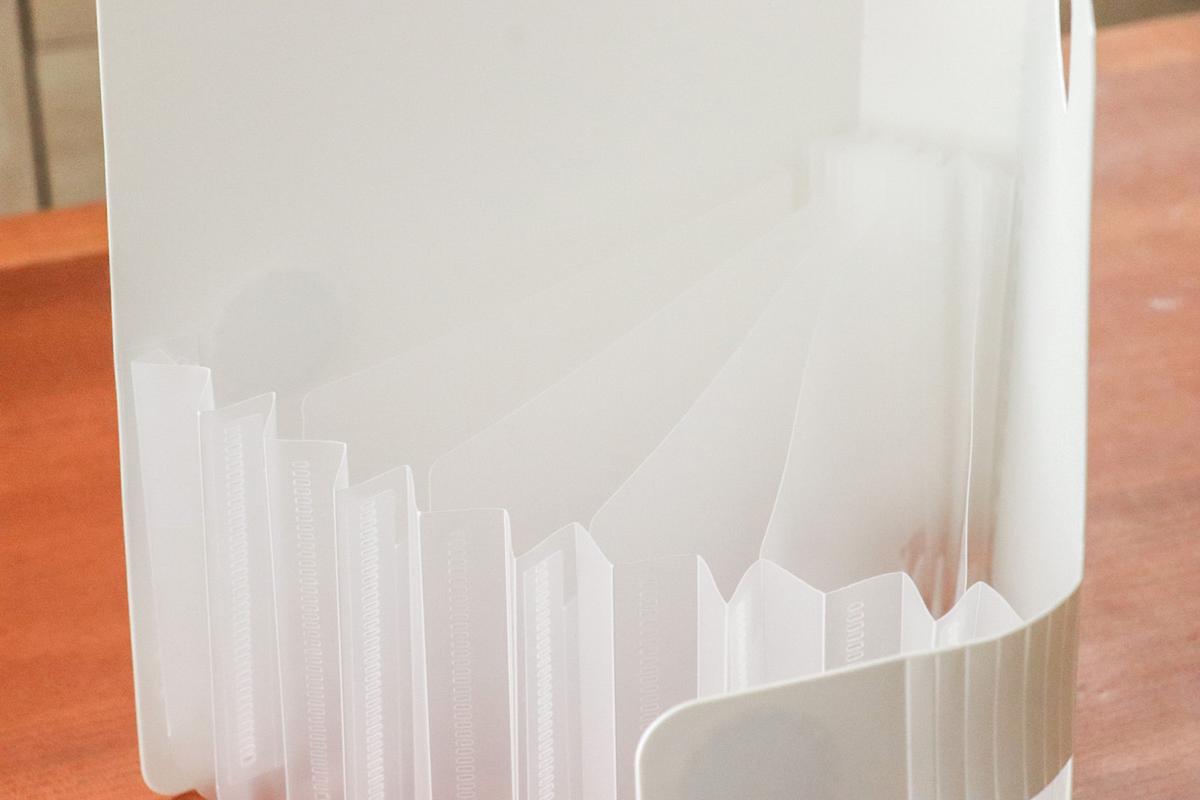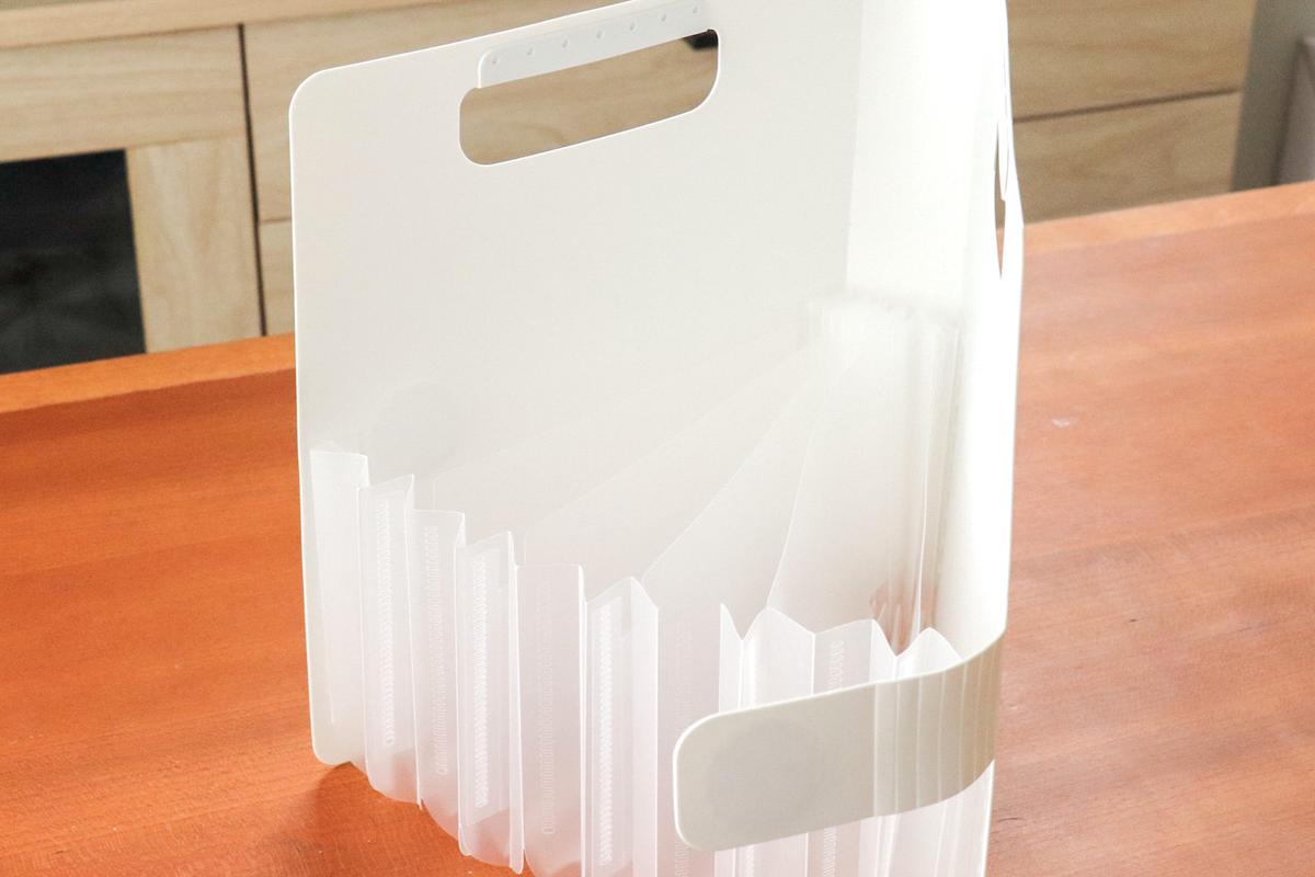 本来は文房具や折り紙の整理などに使うアイテムで、ファイルを開くと蛇腹式のポケットがあらわれます。