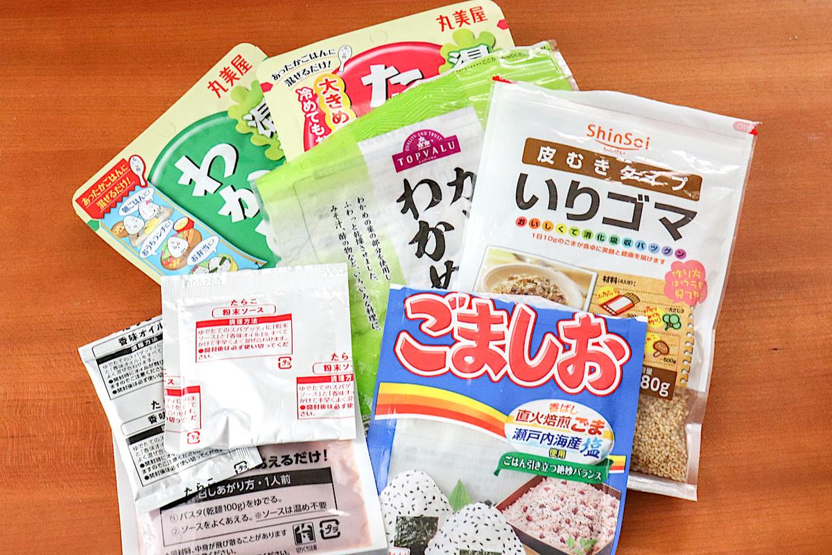 たとえば、乾燥ワカメやごま、ふりかけといった袋に入っている食品たち。