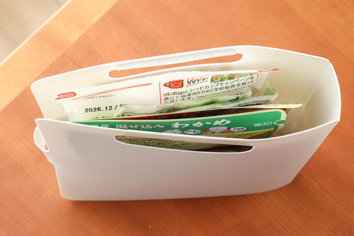 チャック付きの袋に入っている食材や、1人分だけ余ったパスタソースなどは、棚や箱の中で倒れやすく、下に溜まってぐちゃぐちゃになりがちでした。
