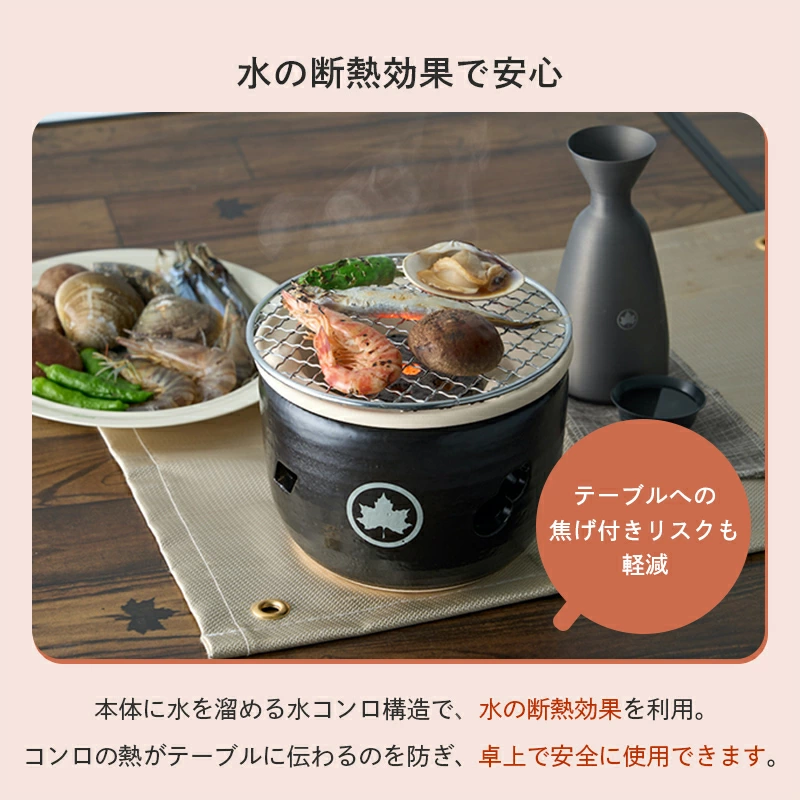 本体に水を溜め、その上に火床を置いて炭に着火する水コンロ。コンロの熱がテーブルに伝わりにくく、テーブルが焦げるリスクを軽減します。