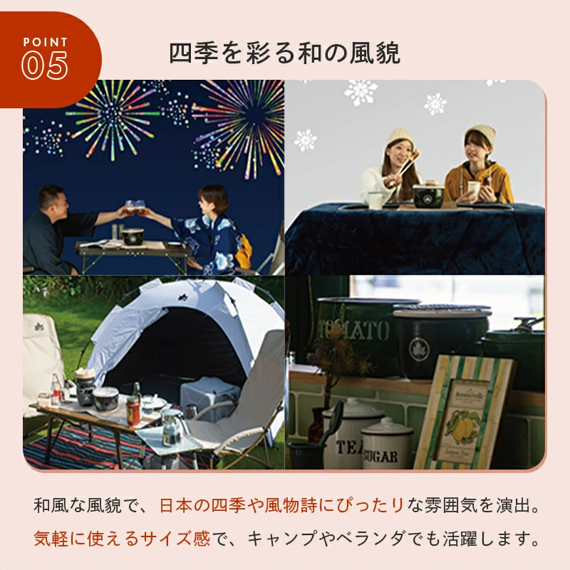 職人の手作業による温かみのある和の風貌は、キャンプはもちろん自宅のベランダでも雰囲気を楽しめます。シルエットもおしゃれで、インテリアのアクセントとしても活躍しますよ。