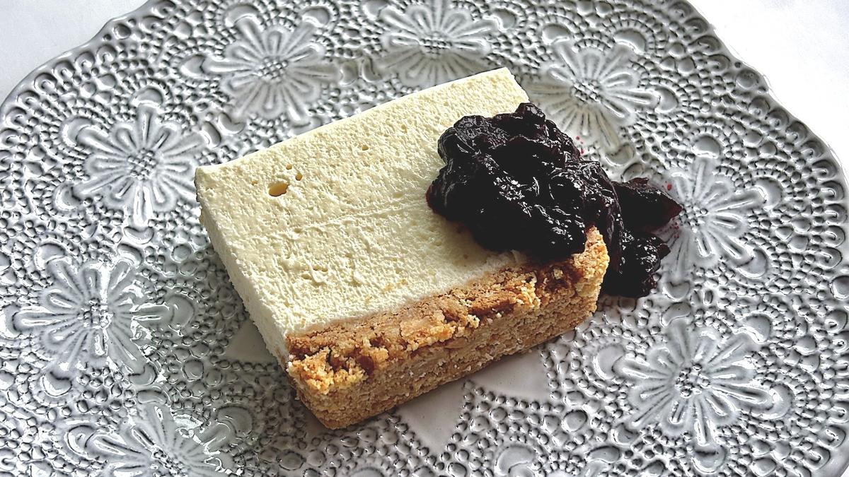 10. シートごと持ち上げて型から外し、食べたい大きさにカットする。器にのせ、ブルーベリージャムなどを添えるのもおすすめ。