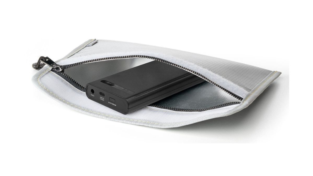 エレコムの難燃性ポーチ。「モバイルバッテリーの爆発対策」に