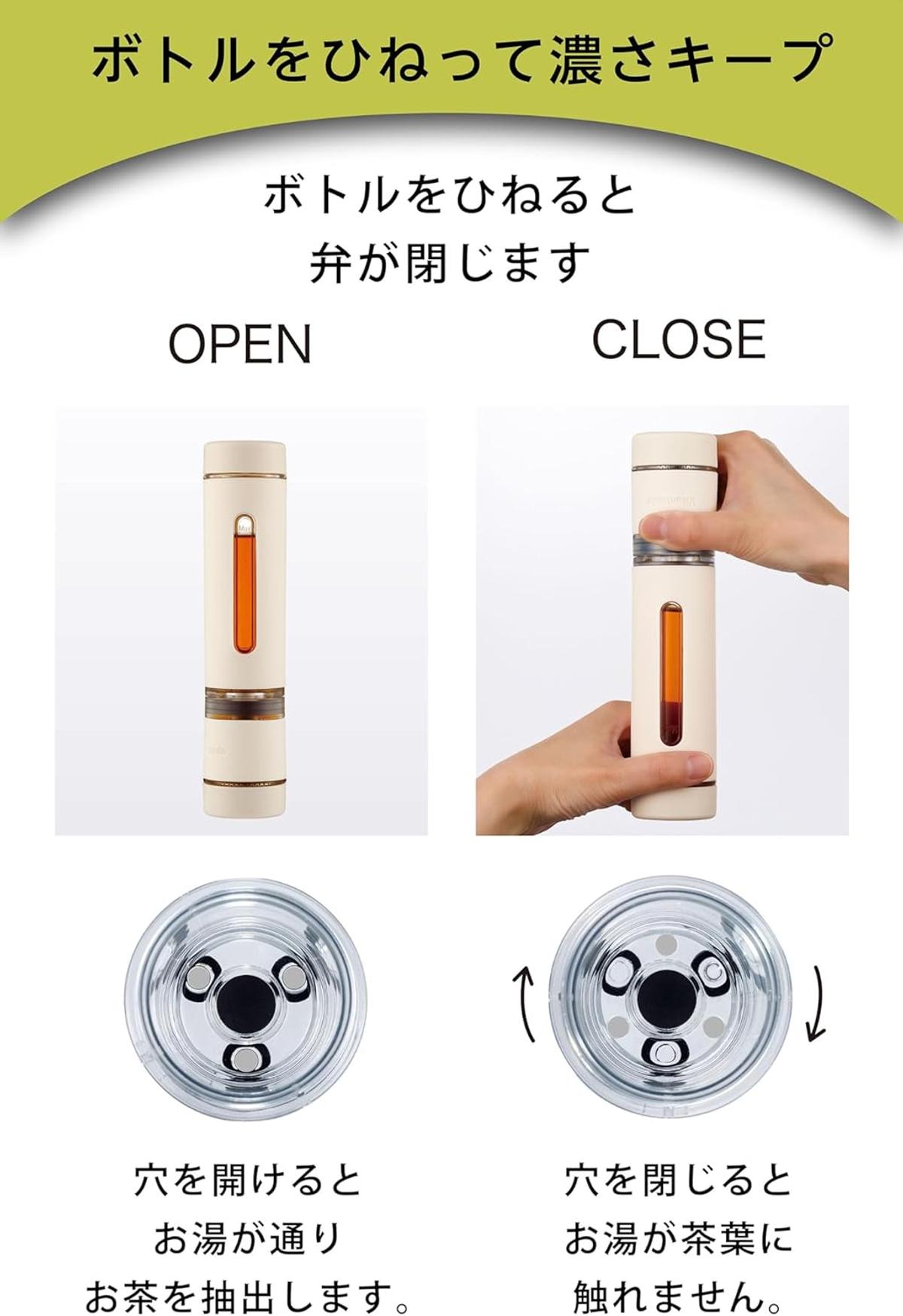 本体をツイストすることで弁が開閉し、茶葉と抽出液を分離できる構造。これにより、好みの濃さをキープしたまま中身を飲み続けられます。